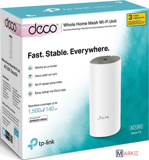 Для бесперебойного доступа к Wi-Fi во всём доме Deco использует систему модулей - избавьтесь от "мертвых зон" раз и навсегда. Комплект Deco E3 из двух устройств (роутер Deco E4R и усилитель сигнала Deco M3W) обеспечивают Wi-Fi на площади до 220 квадратных метров (версия EU). Более широкое покрытие Mesh Wi-Fi при подключении дополнительных усилителей сигнала Deco M3W к настенной розетке. Благодаря современной Mesh-технологии модули Deco образуют единую домашнюю сеть с одним именем. Ваши устройства будут автоматически переключаться между разными модулями Deco на высокой скорости, куда бы вы ни пошли. Deco Е3 обеспечивает быстрое и стабильное соединение со скоростью до 1167 Мбит/с и работает с основными интернет-провайдерами и модемами. Deco способен поддерживать работу даже самой загруженной сети, обеспечивая одновременное соединение для более чем 100 устройств. Родительский контроль ограничивает время в сети и блокирует соответствующий контент, создавая уникальные профили для каждого члена семьи.