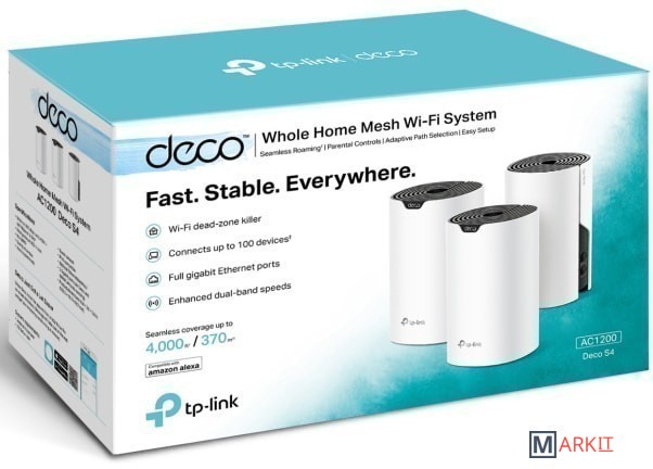 Благодаря проводному и беспроводному соединению между собой, устройства Deco работают как единое целое, обеспечивая максимально быстрый и непрерывный Wi-Fi. Хотите увеличить зону покрытия сети ещё больше? Просто добавьте ещё один модуль Deco.Устройства Deco вместе образуют единую Wi-Fi сеть с одним SSID. Ваш смартфон или планшет будет автоматически подключаться к Deco на самой большой скорости в любой точке вашего дома, обеспечивая по-настоящему бесшовный Wi‑Fi.Deco S4 обеспечивает непрерывное подключение до 100 клиентов. Высокая скорость гарантирована для всех устройств и задач, в том числе для просмотра веб-сайтов, загрузки файлов, стриминга или онлайн‑игр.Модуль Deco S4 может работать в качестве роутера или точки доступа. Просто выберите подходящий режим и ощущите максимальную гибкость при настройке сети!Подключите Alexa и управляйте Deco S4 с помощью голосовых команд. Не отвлекайтесь ни на что.Удобная функция родительского контроля позволит следить за активностью ваших детей в интернете.Deco S4 образует единую Mesh‑сеть со всеми моделями Deco. Если нужно увеличить покрытие, просто добавьте больше модулей.Настройка Deco S4 выполняется быстро и легко. Просто установите систему, загрузите приложение и следуйте инструкциям на экране.Комплектация: 3 устройства Deco S4R1 кабель Ethernet RJ453 адаптера питания1 руководство по быстрой настройке